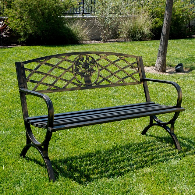 You can find a smaller steel model to fit just about any corner of your yard. Best choice products 50 inch outdoor steel park bench with slatted seat and floral scroll. Every metal bench is made with e steele.